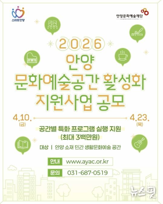 (뉴스핏 = 김수진 기자) 안양문화예술재단은 지역 내 민간 생활문화예술 공간의 자립 기반을 강화하고 문화시민을 육성하기 위한 '2026 문화예술공간 활성화 지원사업' 참여 공간을 공개 모집한다고 8일 밝혔다.