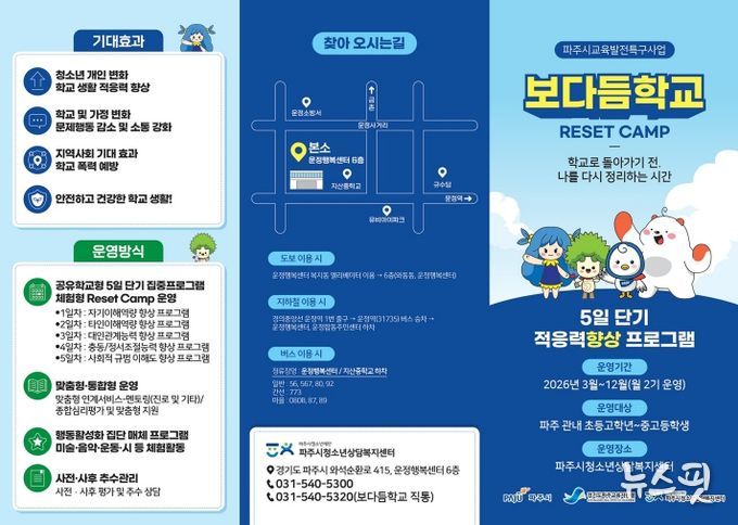 (뉴스핏 = 김호 기자) 파주시가 심리·정서적 이유로 학업에 어려움을 겪는 학생들의 심리 안정과 건강한 학교생활 복귀를 돕기 위해 교육발전특구 시범사업인 ‘보다듬학교’를 본격적으로 운영하며, 핵심 프로그램인 ‘리셋캠프(Reset Camp)’참여자를 모집한다.