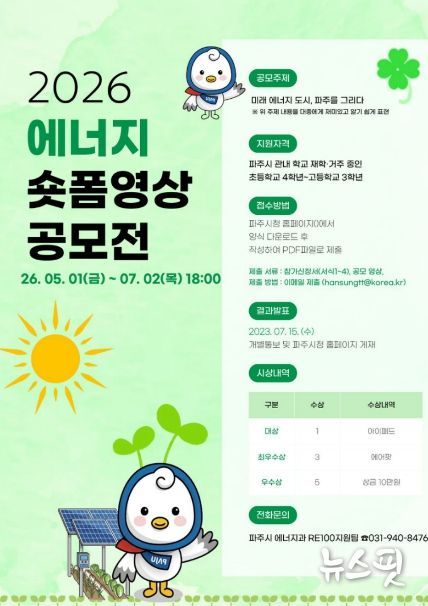 (뉴스핏 = 김호 기자) 파주시는 청소년들의 에너지 인식을 제고하고 디지털 미디어 활용 역량을 강화하기 위해 녪년 파주시 청소년 에너지 숏폼 영상 공모전’을 개최한다.