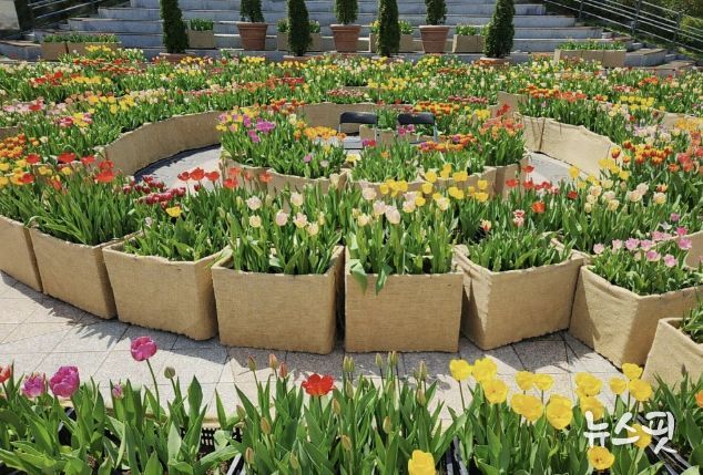이번 화단은 튤립 구근을 상자 식재 방식으로 심은 튤립상자를 활용해 원형 동선을 따라 미로처럼 걸을 수 있도록 조성한 것이 특징이다. 방문객들은 미로 길을 따라 이동하며 꽃을 가까이에서 감상할 수 있고, 여러 색의 튤립이 어우러진 화단에서 한층 화려하고 풍성한 봄 풍경을 즐길 수 있다.