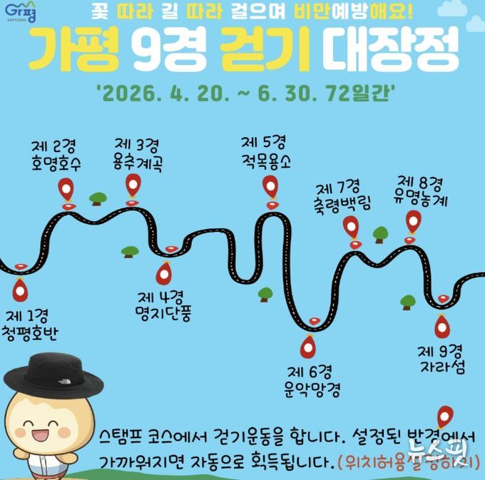 (뉴스핏 = 김호 기자) 가평군의 수려한 자연경관을 배경으로 건강을 다지는 ‘2026 가평 9경 걷기 대장정’이 오는 20일부터 시작된다. 가평군보건소는 군민들의 비만을 예방하고 걷기 실천율을 높이기 위해 이번 프로그램을 마련했다고 15일 밝혔다.