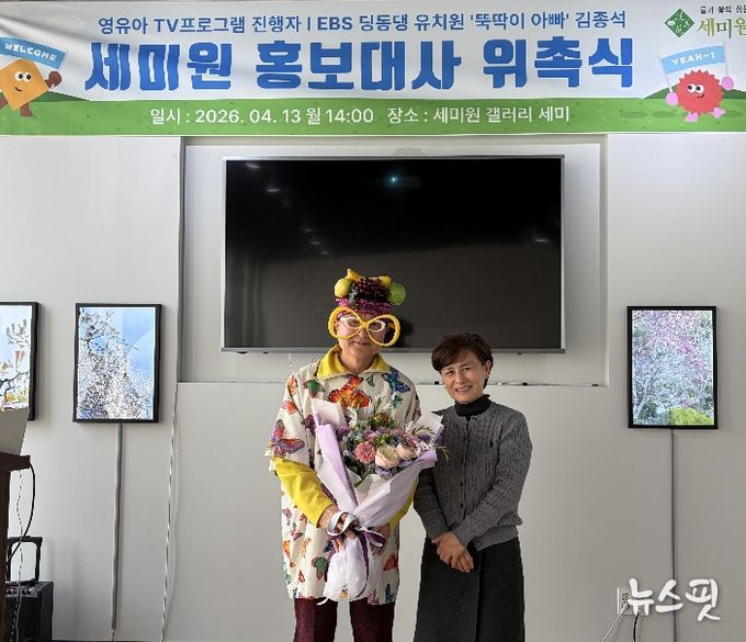 (뉴스핏 = 김호 기자) 재단법인 세미원은 지난 13일 세미원 갤러리 세미에서 ‘뚝딱이 아빠’로 알려진 영유아 TV 프로그램 진행자 김종석을 홍보대사로 위촉했다.