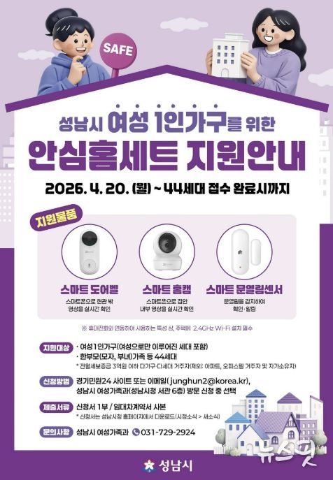 (뉴스핏 = 김호 기자) 성남시는 여성 1인 가구의 범죄예방과 안전한 주거생활을 위해 ‘안심 홈세트 3종’을 지원한다고 16일 밝혔다.