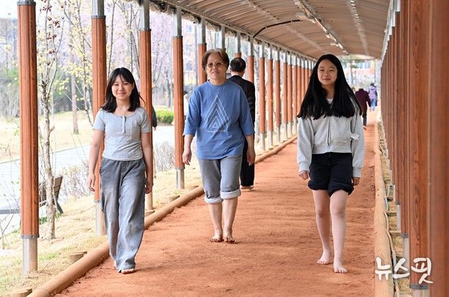 아늑하고 따뜻한 분위기를 선호한다면 감일문화공원의 황톳길이 제격이다. 하남시는 연인과 가족들이 사계절 내내 쾌적하게 맨발 걷기를 즐길 수 있도록 이곳에 세심한 배려를 담았다. 비를 막아주는 캐노피는 물론이고, 걷고 난 뒤 발을 씻을 수 있는 세족장까지 완비되어 있어 마무리까지 완벽하게 책임진다. 붉은 황토 위를 나란히 걷다 보면 평소 하지 못했던 진솔한 대화가 자연스럽게 흘러나온다. 부드러운 흙을 밟으며 전해지는 대지의 온기는 서로의 마음을 확인하고 깊은 유대감을 쌓는 아주 특별한 통로가 되어준다.