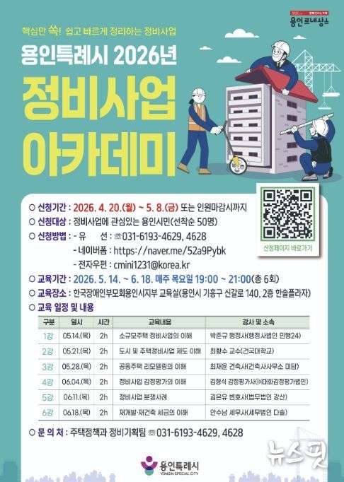 (뉴스핏 = 김수진 기자) 용인특례시는 4월 20일부터 5월 8일까지 ‘2026년 정비사업 아카데미’ 수강생을 모집한다.