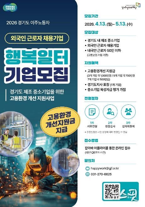 (뉴스핏 = 김수진 기자) 경기도와 경기도일자리재단은 도내 외국인 근로자를 고용한 중소 제조기업을 대상으로 ‘2026년 경기도 이주노동자 행복일터 선정사업’ 참여기업을 모집한다고 20일 밝혔다.