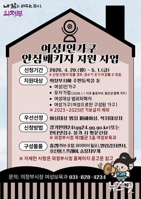 (뉴스핏 = 김호 기자) 의정부시는 4월 20일부터 5월 1일까지 12일간 온․오프라인을 통해 여성 1인 가구 안심패키지 지원사업의 신청을 접수한다.