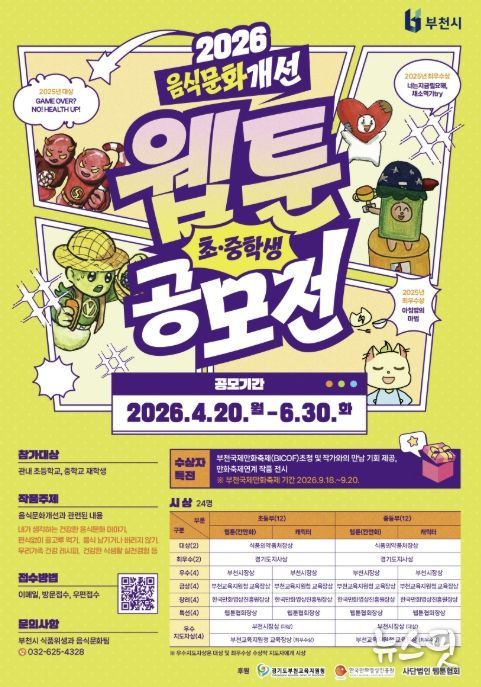 (뉴스핏 = 김호 기자) 부천시는 4월 20일부터 6월 30일까지 ‘2026년 음식문화개선 초중학생 웹툰·캐릭터 공모전’을 연다. 이번 공모전은 학생들이 일상 속 음식문화를 주제로 직접 창작에 참여함으로써 올바른 식문화에 대한 인식을 높이기 위해 매년 추진되고 있다.