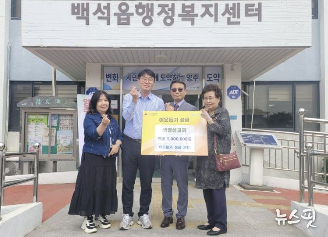 (뉴스핏 = 김호 기자) 양주시 백석읍은 지난 17일 생명샘교회가 지역 내 어려운 이웃을 돕기 위한 성금 100만 원을 기탁했다고 밝혔다.