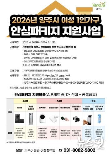 (뉴스핏 = 김호 기자) 양주시는 관내 여성 1인 가구 등 범죄 취약 여성 가구의 안전한 일상을 지원하기 위해 ‘2026년 양주시 여성 1인 가구 안심패키지 지원사업’을 추진한다고 20일 밝혔다.