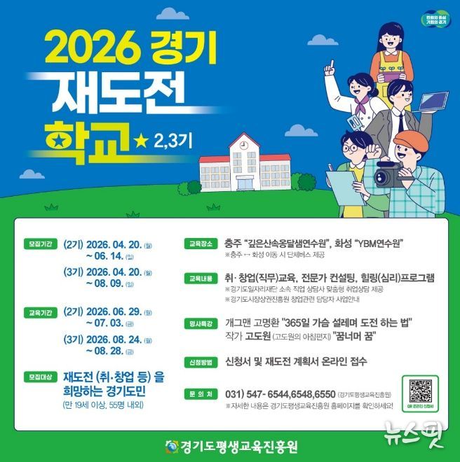 (뉴스핏 = 김수진 기자) 경기도와 경기도평생교육진흥원은 취업이나 창업 실패를 경험한 도민의 재기를 지원하기 위해 오는 20일부터 ‘2026년 경기 재도전학교’ 2~3기 참가자를 각각 55명 내외로 모집한다.