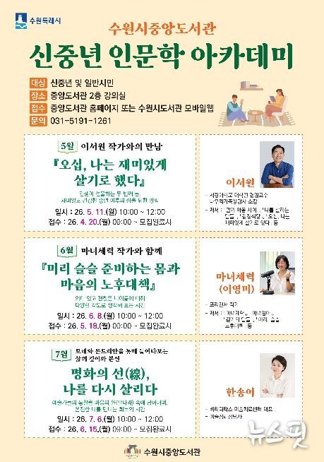 (뉴스핏 = 김호 기자) 수원시 중앙도서관이 5월부터 7월까지 매달 1회 운영하는 ‘신중년 인문학 아카데미’ 수강생을 모집한다고 21일 밝혔다.