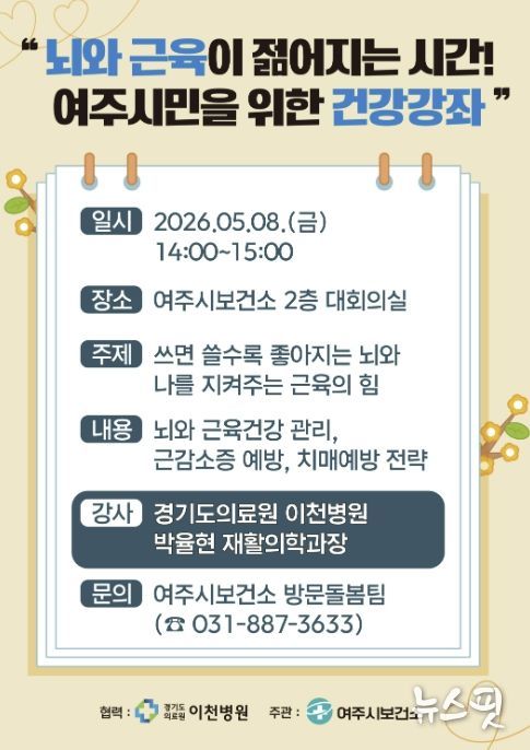 (뉴스핏 = 김호 기자) 여주시보건소 건강증진과는 오는 5월 8일 오후 2시, 보건소 2층 대회의실에서 여주시민을 위한 건강강좌 '뇌와 근육이 젊어지는 시간!'을 개최한다고 밝혔다.