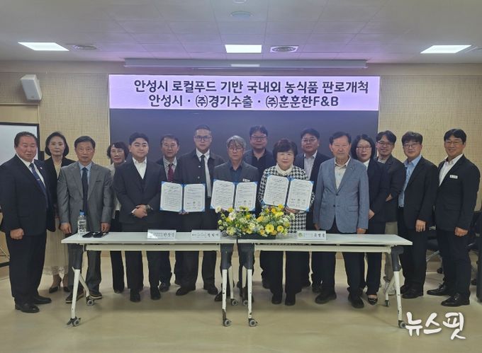 (뉴스핏 = 김수진 기자) 안성시 농업기술센터는 지난 4월 17일, 안성시 농특산물 및 농식품의 국내외 판로 확대를 위해 ㈜경기수출, ㈜훈훈한F&B와 전략적 업무협약(MOU)을 체결했다고 밝혔다.