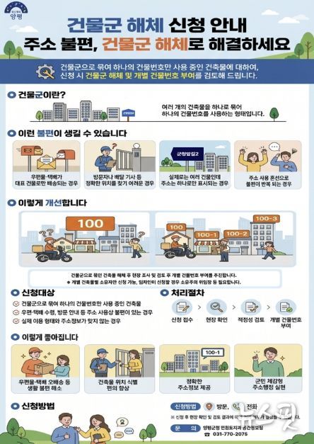 (뉴스핏 = 김호 기자) 양평군은 건물군으로 묶여 하나의 건물번호만 사용하고 있는 건축물을 대상으로 건물군 해체 및 개별 건물번호 부여를 추진해 군민의 주소 사용 불편을 해소할 계획이라고 밝혔다. 이번 사업은 국민불편사항 개선 과제의 일환으로 추진되며, 실제 이용 형태와 맞지 않는 주소 체계를 정비해 보다 정확한 주소 사용 환경을 조성하기 위해 마련됐다.