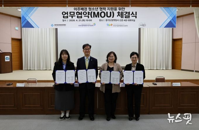 (뉴스핏 = 김수진 기자) 경기도미래세대재단은 21일 수원시 팔달구 옛 경기도청사에서 수원시글로벌청소년드림센터, 안산시글로벌청소년센터, 화성시글로벌청소년센터와 이주배경 청소년 지원을 위한 업무협약을 체결했다.