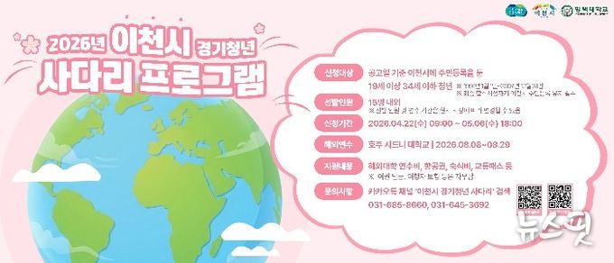 (뉴스핏 = 김호 기자) 이천시는 지역 청년들에게 글로벌 경험을 제공하기 위해 '이천시 경기청년 사다리프로그램(운영기관: 평택대학교 산학협력단)' 2기 참여자를 모집한다고 21일 밝혔다.
