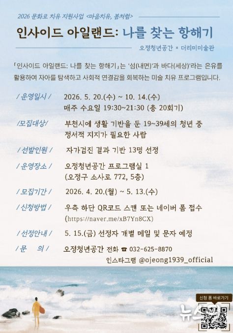 참여 대상은 사회적 연결과 정서적 지원이 필요한 부천시 거주 또는 활동 청년이다. 5월 20일부터 10월 14일까지 매주 수요일 운영되며, 포스터에 안내된 큐알(QR) 코드를 통해 신청할 수 있다.