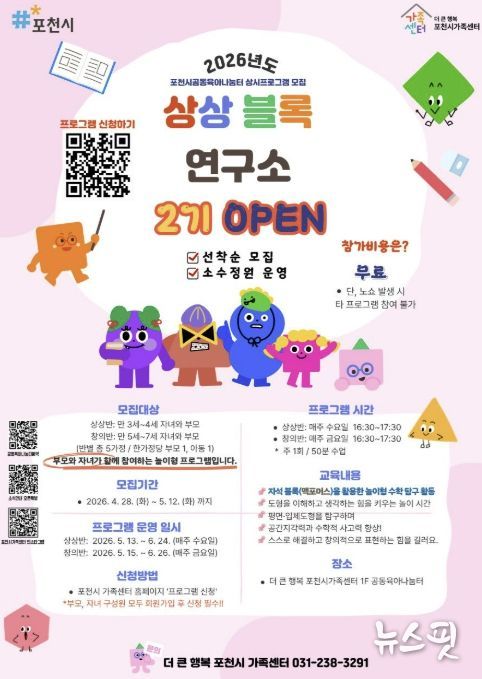 (뉴스핏 = 김호 기자) 포천시 직영 더 큰 행복 포천시가족센터가 공동육아나눔터 상시 프로그램 ‘상상블록연구소’ 2기 참여자 모집을 진행한다.