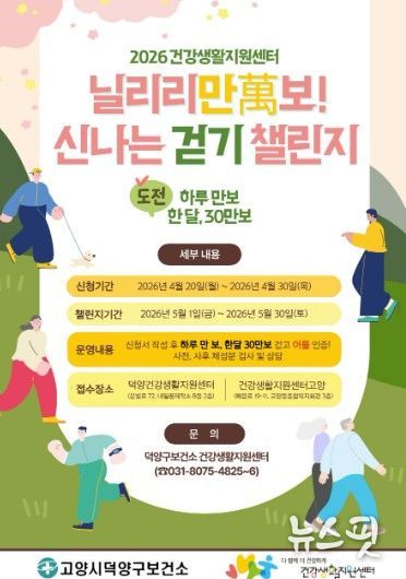 (뉴스핏 = 김수진 기자) 고양특례시 덕양구보건소 건강생활지원센터는 지역주민의 건강생활 실천 확산을 위한 생활밀착형 걷기 프로그램 ‘2026 닐리리만보 걷기 챌린지’를 오는 5월부터 운영을 시작한다.