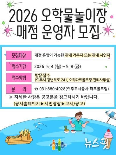 (뉴스핏 = 김호 기자) 여주도시공사는 2026년 오학물놀이장 운영을 앞두고 이용객 편의 제공을 위한 매점 운영자를 공개 모집한다고 밝혔다.