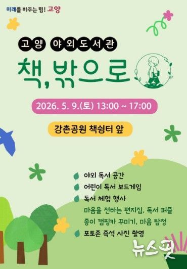 (뉴스핏 = 김수진 기자) 고양특례시는 오는 5월 9일 오후 1시부터 5시까지 일산동구 강촌공원 책쉼터 앞에서 고양 야외도서관 ‘책, 밖으로’를 운영한다.