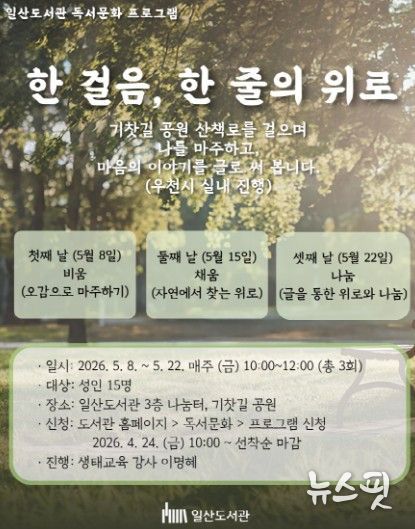 일산도서관 관계자는 “‘한 걸음, 한 줄의 위로’는 자연 속에서 천천히 걷고 글로 자신을 표현하는 과정을 통해 스스로를 돌보고 치유하는 프로그램”이라며, “참여자들이 서로의 이야기를 나누며 공감과 위로를 경험하는 시간이 되길 바란다”고 전했다.