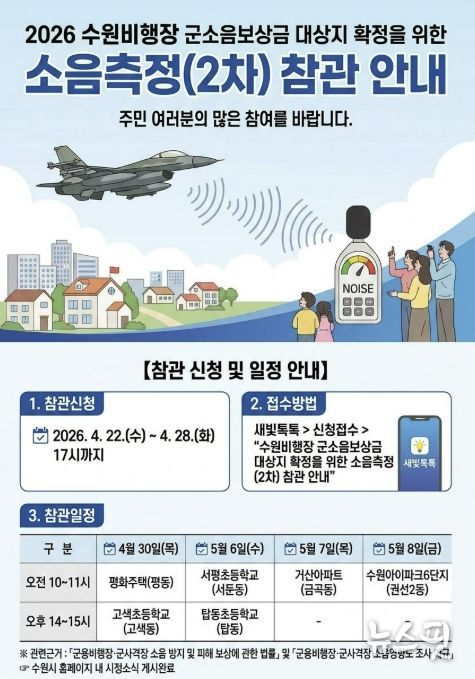 (뉴스핏 = 김호 기자) 수원특례시가 수원비행장 인근 주민들의 소음 피해 보상 근거가 될 국방부의 ‘수원비행장 소음 영향도 조사 2차 소음측정’ 주민 참관 참여자를 모집한다. 4월 28일까지 새빛톡톡으로 신청할 수 있다.
