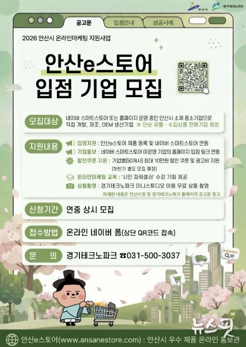 입점 대상은 네이버 스마트스토어 또는 자체 누리집을 운영하는 안산시 소재 중소기업과 소상공인 가운데 직접 개발·제조하거나 주문자상표부착생산(OEM) 방식으로 생산하는 기업이다. 단순 유통·수입 상품 판매 기업은 제외된다.