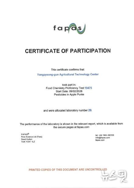 (뉴스핏 = 김호 기자) 양평군은 영국 식품환경연구청(FERA)이 주관한 ‘2026년 잔류농약 국제비교숙련도 평가’에서 최고 수준의 분석능력을 인정받아 3년 연속 우수성을 입증했다고 21일 밝혔다.