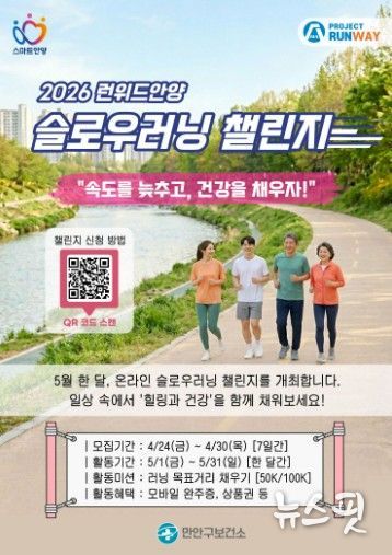 (뉴스핏 = 김수진 기자) 안양시는 시민들의 일상 속 신체활동을 독려하고 건강한 운동 습관 형성을 돕기 위해 오는 5월 한 달간 ‘2026 런위드안양 슬로우러닝 챌린지’를 개최한다고 23일 밝혔다. 참가자 모집은 이달 24일부터 30일까지 진행된다.