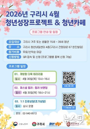 이번 4월 프로그램은 구리시에 거주하거나 생활권을 둔 15세부터 39세까지의 청년을 대상으로 하며, 구리시 청년내일센터 4층에서 진행된다. 참가비는 무료이며 프로그램별 중복 신청이 가능하다. 다만 모집은 선착순으로 마감된다.