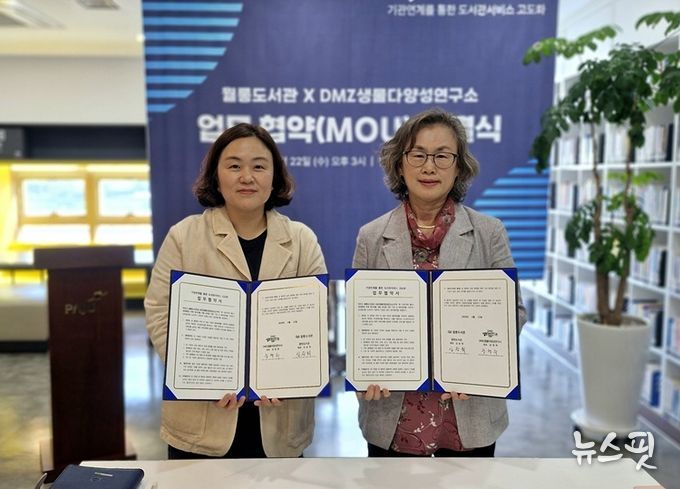 (뉴스핏 = 김호 기자) 파주시 월롱도서관은 지난 22일 디엠지(DMZ)생물다양성연구소와 지역사회 독서진흥 및 생태환경 분야 협력을 위한 업무협약을 체결했다.