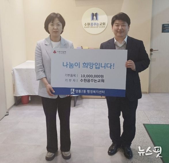 (뉴스핏 = 김호 기자) 수원시 영통구 영통2동은 지난 23일 수원꿈꾸는교회가 지역사회 내 취약계층 지원을 위해 교인들과 함께 모금한 사랑의 성금 1천만원을 영통2동 행정복지센터에 기부했다고 밝혔다.