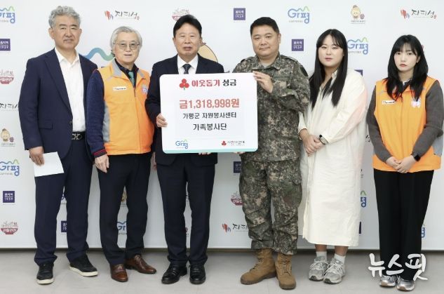 (뉴스핏 = 김호 기자) 가평군 자원봉사센터 가족봉사단은 23일 가평군청 군수실에서 이웃돕기 성금 기탁 전달식을 가졌다. 이날 행사에는 서태원 가평군수를 비롯해 연기복 가족봉사단 회장, 이명열 가평군 자원봉사센터장 등이 참석했다.