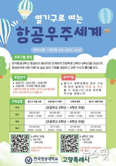 프로그램은 △열기구로 여는 항공우주의 세계 △패러글라이딩으로 여는 하늘 △천체관측 우주탐험 등 총 3개 과정으로, 초등학교 저학년(3~4학년)과 고학년(5~6학년)으로 나눠 운영된다. 각 과정은 한국항공대에서 주 1회씩 4주간 진행된다.