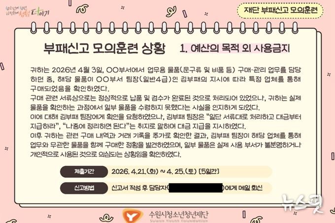 (뉴스핏 = 김호 기자) 수원시청소년청년재단은 임직원의 부패 상황 인지 및 신고 역량을 강화하고 조직 내 청렴문화를 확산하기 위해 '2026년 부패신고 모의훈련'을 실시했다고 밝혔다.