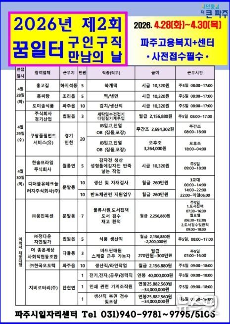 (뉴스핏 = 김수진 기자) 파주시는 오는 28일부터 30일까지 파주고용복지플러스센터(금촌동 엠에이치(MH)타워 8층)에서 2026년 제2회 ‘구인·구직 만남의 날’을 개최한다.