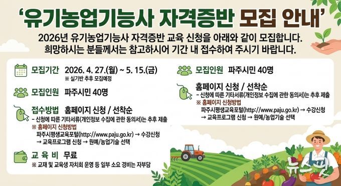 (뉴스핏 = 김호 기자) 파주시농업기술센터는 친환경농업 분야 농업 전문 인력 육성을 위한 '2026년 유기농업기능사 자격증 취득’교육생을 4월 27일부터 5월 15일까지 모집한다.