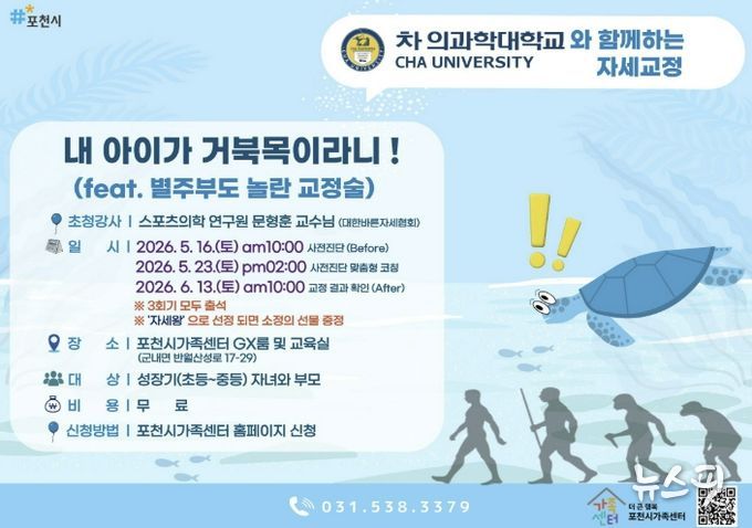 (뉴스핏 = 김호 기자) 포천시 더 큰 행복 포천시가족센터는 오는 5월 16일부터 6월 13일까지 성장기 자녀를 둔 가족을 대상으로 부모역할지원사업 ‘내 아이가 거북목이라니! feat.별주부도 놀란 교정술’ 프로그램을 운영한다.