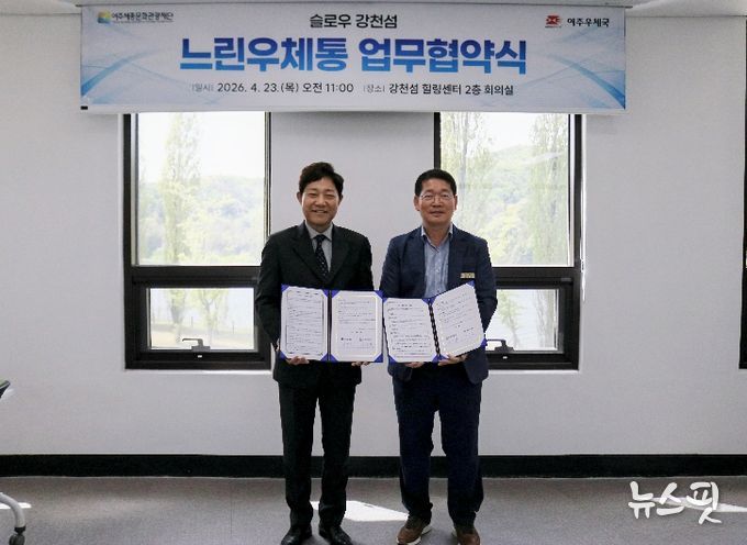 (뉴스핏 = 김호 기자) 여주세종문화관광재단과 여주우체국은 4월 23일 강천섬 힐링센터에서 ‘슬로우 강천섬 느린우체통 업무협약(MOU)’을 체결했다. 빠르게 흘러가는 일상 속에서 잠시 걸음을 멈추고, 소중한 사람에게 미래의 마음을 전할 수 있는 감성 관광콘텐츠를 공동으로 운영하기 위해서다.