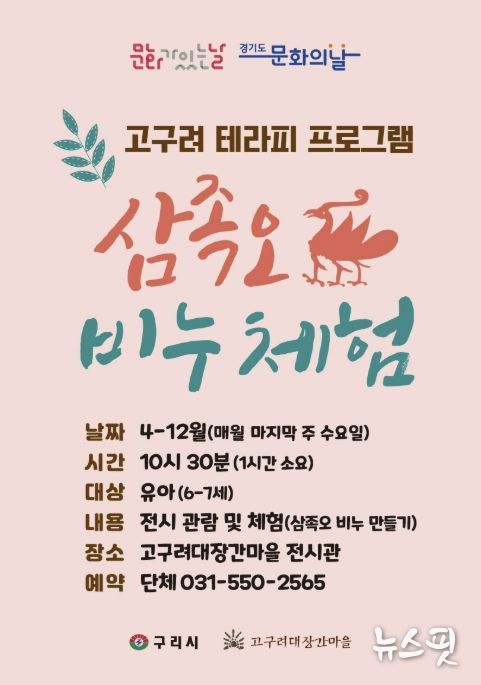 (뉴스핏 = 김수진 기자) 구리시는 4월부터 고구려대장간마을에서 매월 마지막 주 수요일 ‘문화가 있는 날’을 맞아 ‘삼족오 비누 체험! 고구려 치료 프로그램’을 운영한다고 밝혔다.