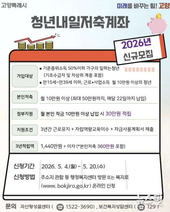 (뉴스핏 = 김호 기자) 고양특례시는 5월 4일부터 시작하는 청년내일저축계좌 신규 가입자 모집을 앞두고, 가입 독려에 나섰다.