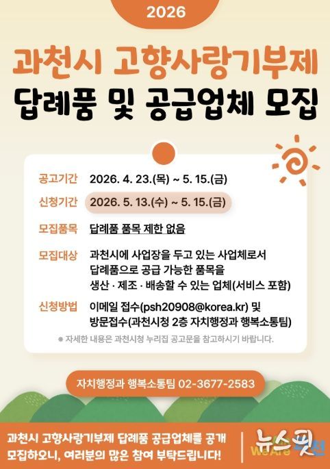 신청 대상은 답례품으로 제공할 수 있는 물품을 생산·제조하고 배송이 가능한 업체다. 참여를 희망하는 업체는 과천시 누리집 ‘과천소식'고시‧공고’에서 신청 서식을 작성한 뒤, 5월 13일부터 15일까지 전자우편 또는 과천시청 방문을 통해 서류를 제출하면 된다.