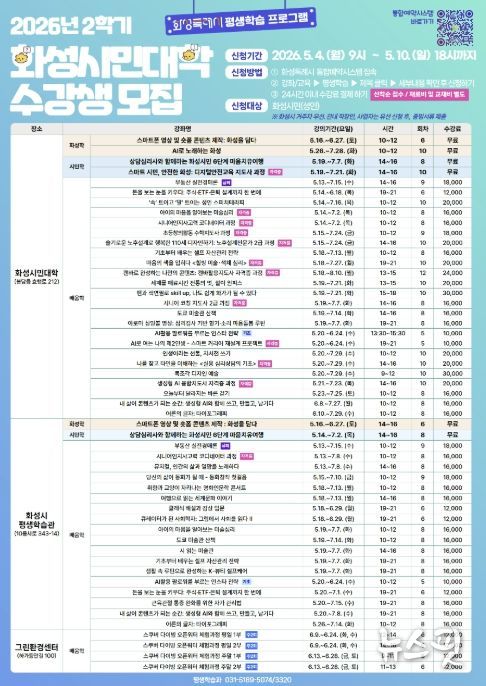 (뉴스핏 = 김수진 기자) 화성특례시는 2026년 화성시민대학 2학기 수강생을 오는 5월 4일부터 5월 10일까지 선착순으로 모집한다고 밝혔다.