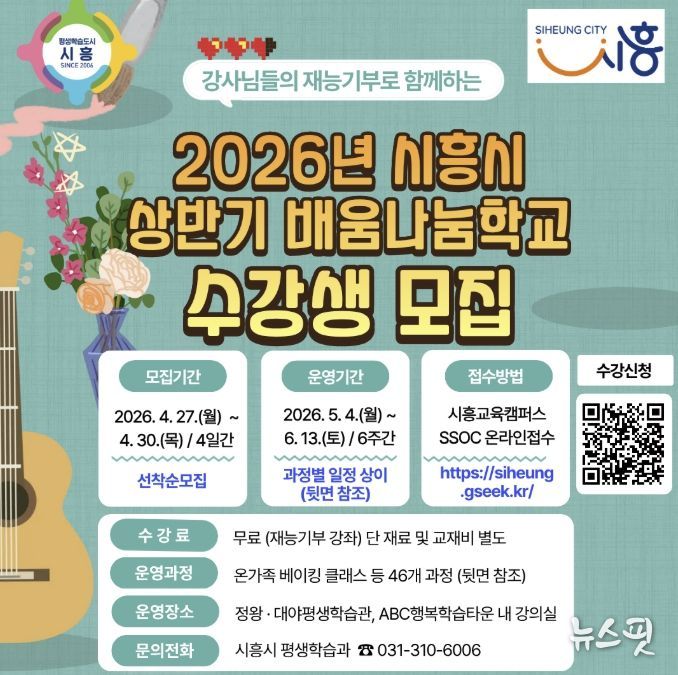 (뉴스핏 = 김수진 기자) 시흥시는 시민이 직접 강사가 되어 재능을 나누는 열린 평생학습 사업 ‘2026년 상반기 시흥시 배움나눔학교’에 참여할 수강생을 모집한다.