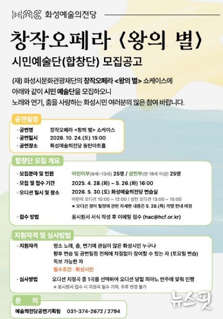 (뉴스핏 = 김수진 기자) (재)화성시문화관광재단은 오는 10월 개최 예정인 창작오페라 '왕의 별' 쇼케이스 무대에 참여할 시민합창단을 모집한다.