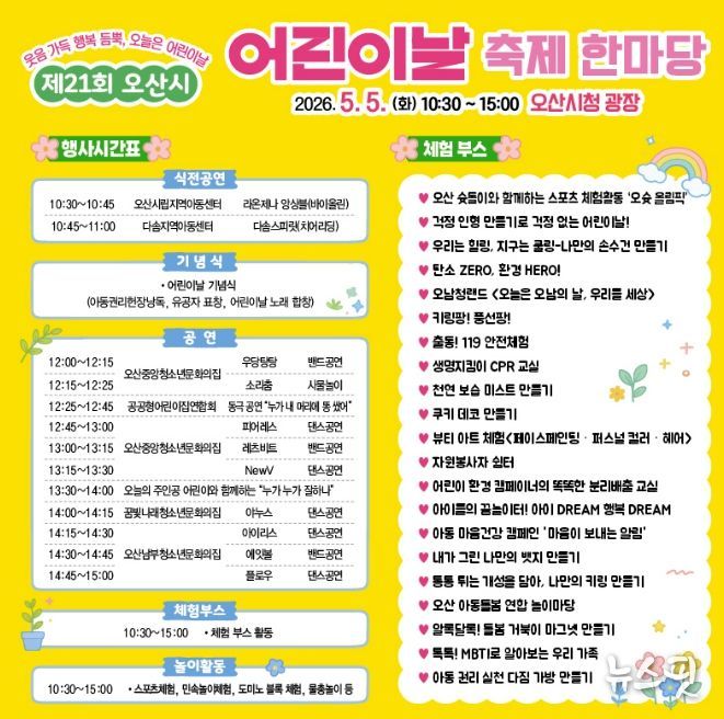 (뉴스핏 = 김수진 기자) 오산시는 오는 5월 5일 어린이날을 맞아 오산시청 광장에서 ‘제21회 오산시 어린이날 축제 한마당’을 개최한다고 밝혔다.