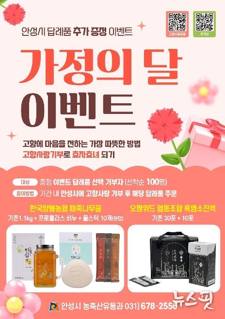 (뉴스핏 = 김수진 기자) 안성시는 오이데이와 5월 가정의 달을 맞아 고향사랑기부제 참여 확대와 지역 농산물 소비 촉진을 위해 ‘오이데이 이벤트’와 ‘가정의 달 이벤트’를 추진한다고 밝혔다.