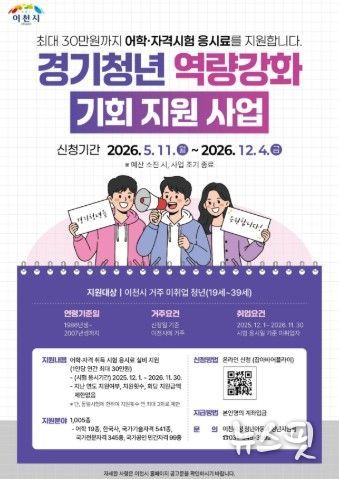 (뉴스핏 = 김수진 기자) 이천시가 오는 5월 11일부터 미취업 청년의 어학·자격시험 응시료를 지원하는 ‘경기청년 역량강화 기회지원 사업’ 대상자 모집에 들어간다.